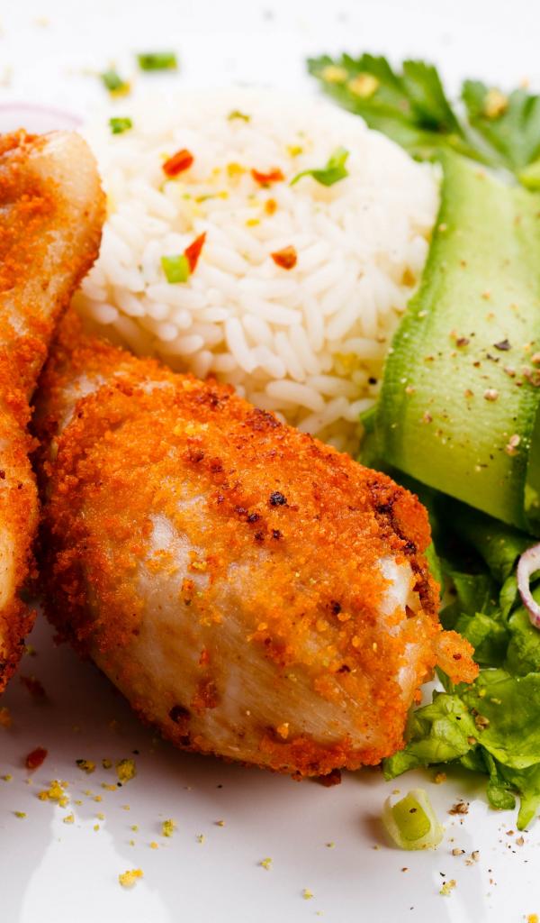 Обои Куриные ножки с рисом и салатом на белой тарелке