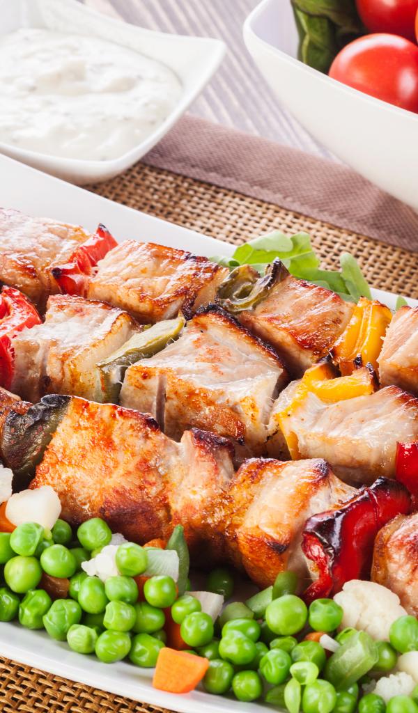 Обои Аппетитный румяный шашлык с зеленым горошком на тарелке