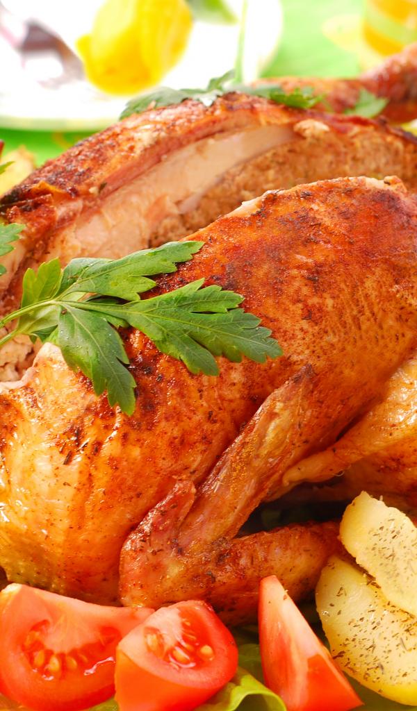 Обои Запеченная курица на столе со свежими помидорами