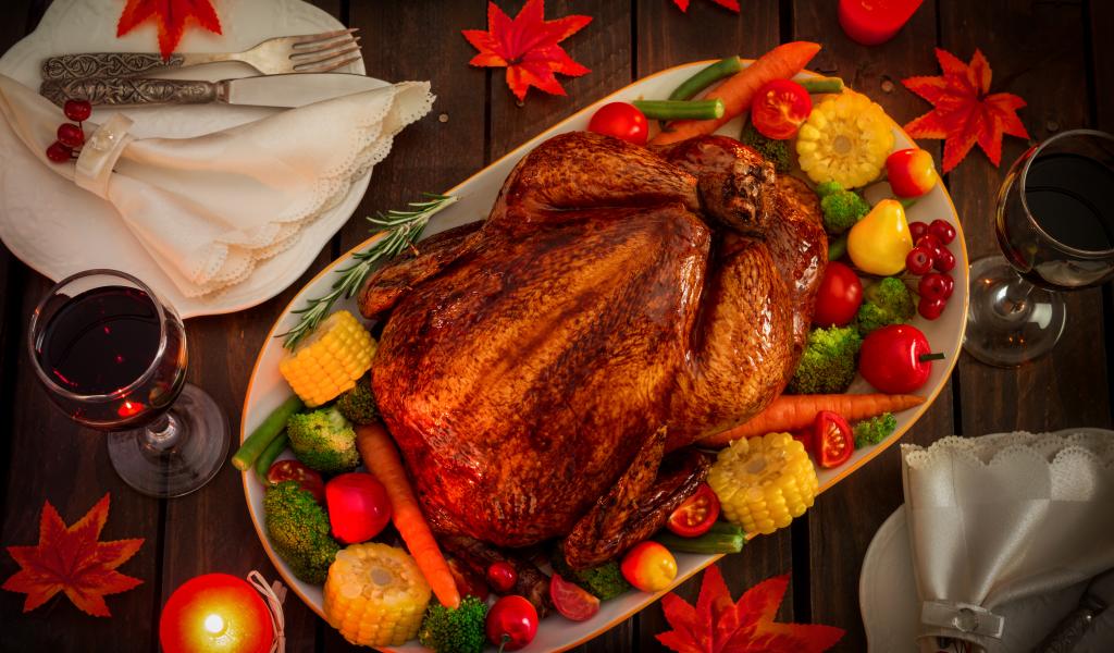 Обои Запеченная курица с овощами на столе с вином