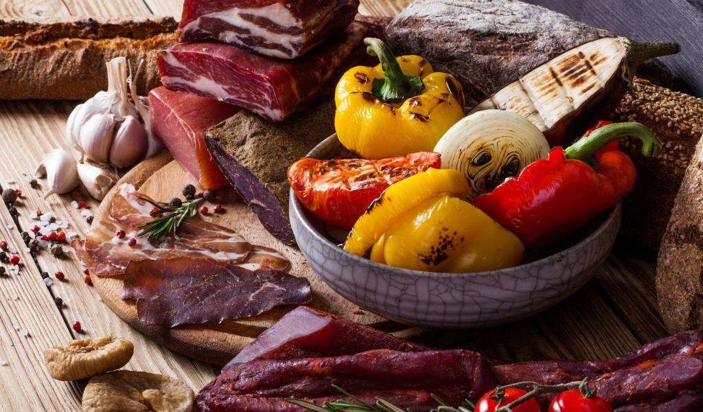 Обои Мясные продукты на столе с запеченными овощами