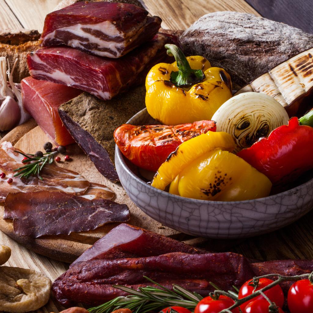 Обои Мясные продукты на столе с запеченными овощами