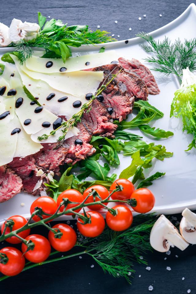 Обои Мясо с сыром, овощами и зеленью на тарелке