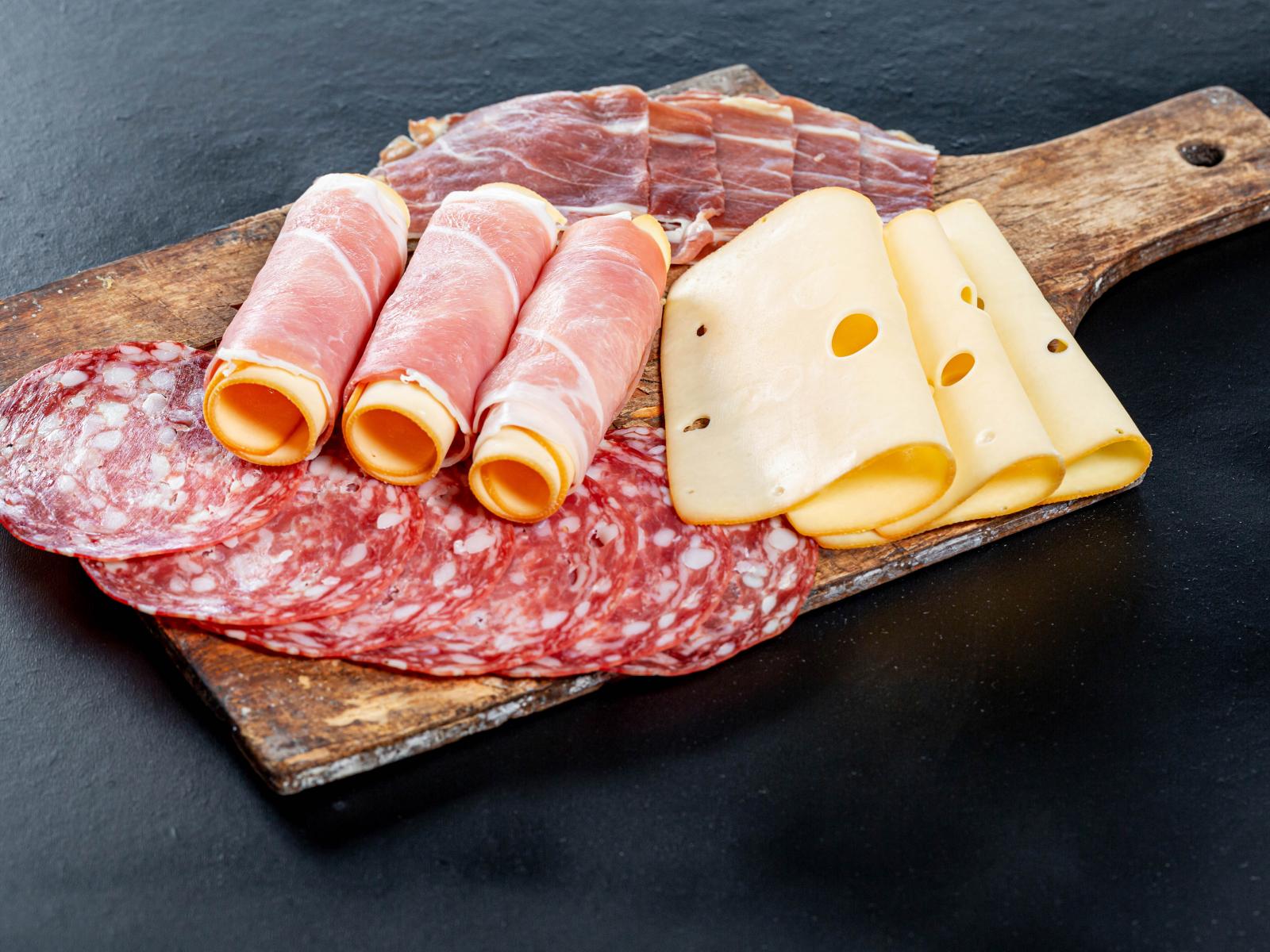 Обои Ветчина на доске с колбасой и твердым сыром