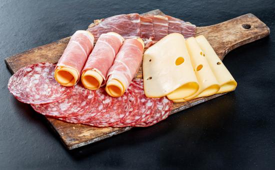 Обои Куски сыра, ветчины и колбасы на доске