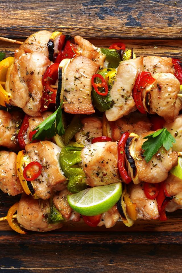 Обои Вкусный куриный шашлык с овощами на шпажках