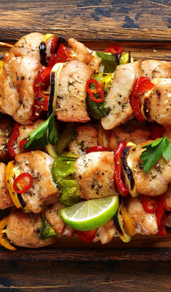 Обои Вкусный куриный шашлык с овощами на шпажках