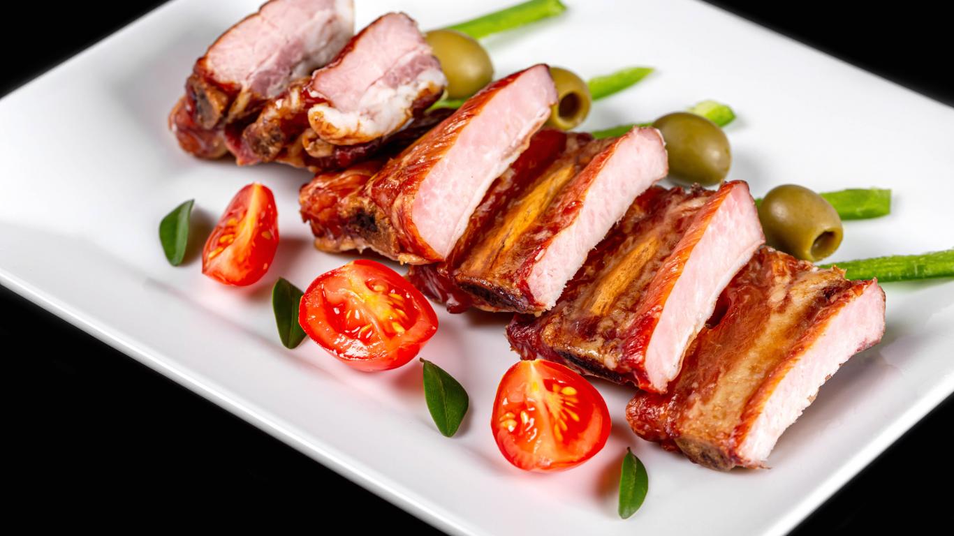Обои Запеченные ребрышки на белой тарелке с помидорами и оливками