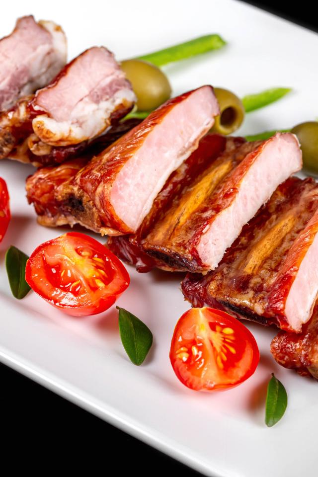 Обои Запеченные ребрышки на белой тарелке с помидорами и оливками