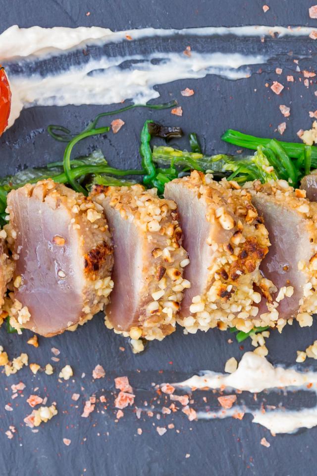 Обои Вяленое мясо на столе с зеленью и помидором