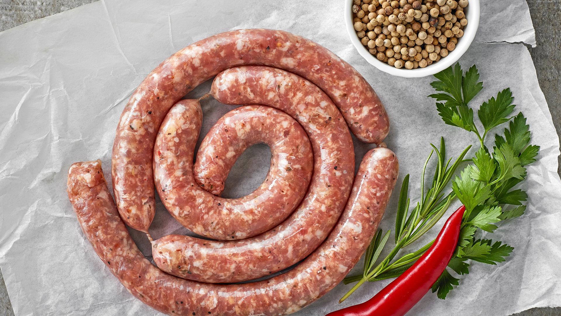 Обои Домашняя колбаса на столе с зеленью и перцем