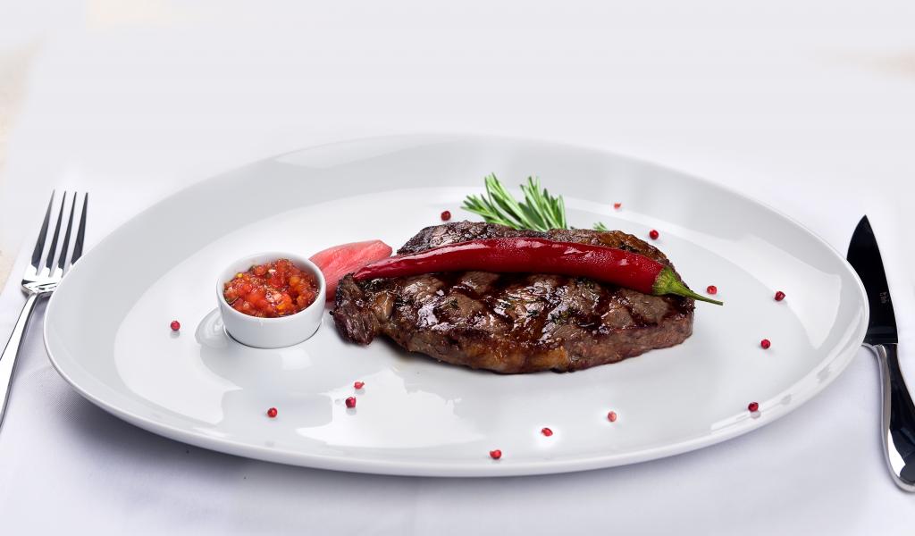Обои Стейк с кровью на тарелке с красным перцем