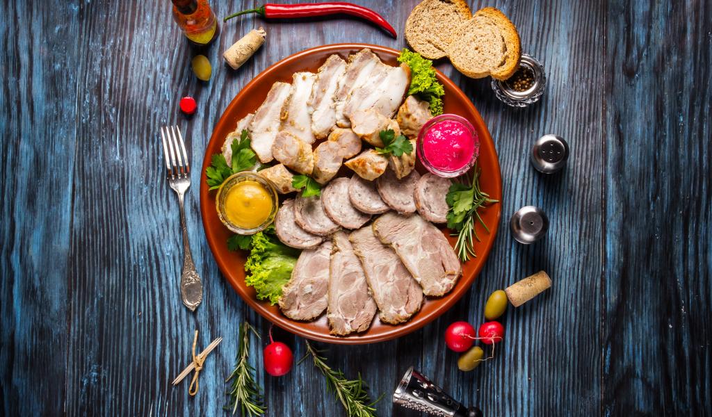 Обои Мясное ассорти в тарелке с соусом и зеленью