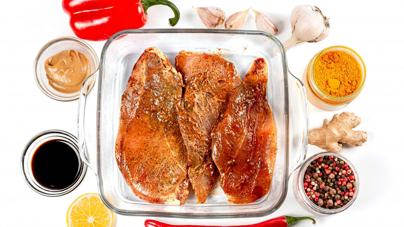 Обои Маринованное мясо на столе со специями и соусом