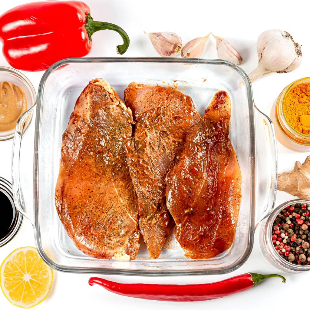 Обои Маринованное мясо на столе со специями и соусом