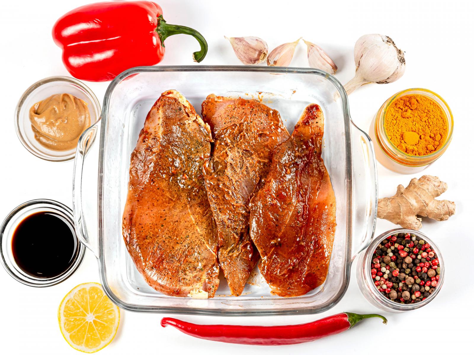 Обои Маринованное мясо на столе со специями и соусом