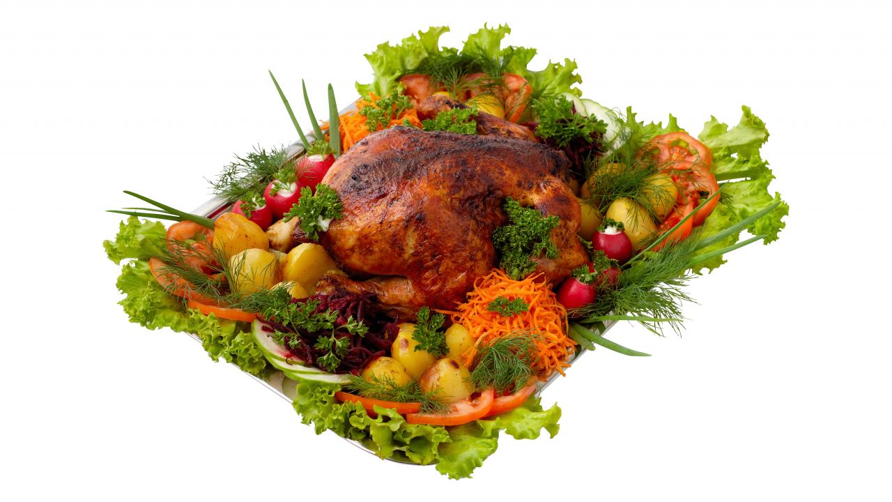 Обои Запеченная курица с овощами на белом фоне