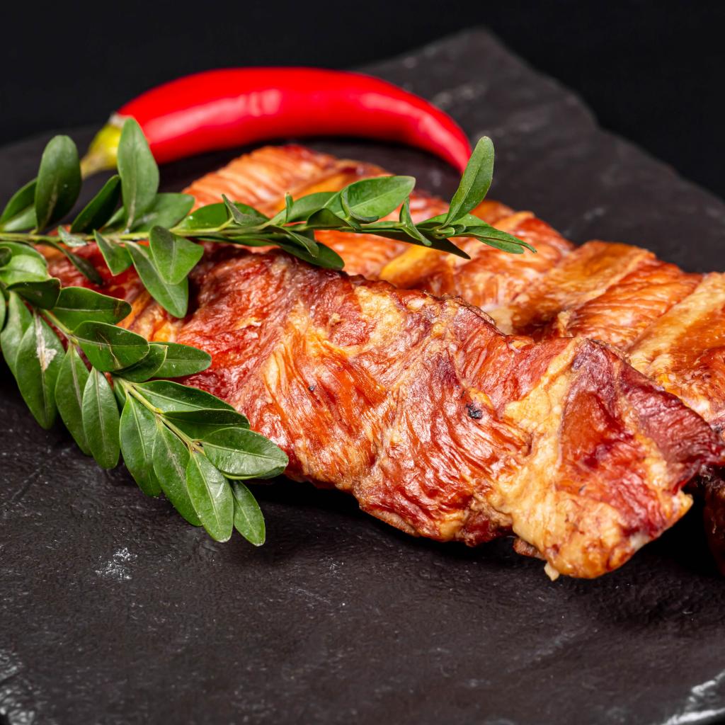 Обои Копченые свиные ребрышки с зелеными листьями