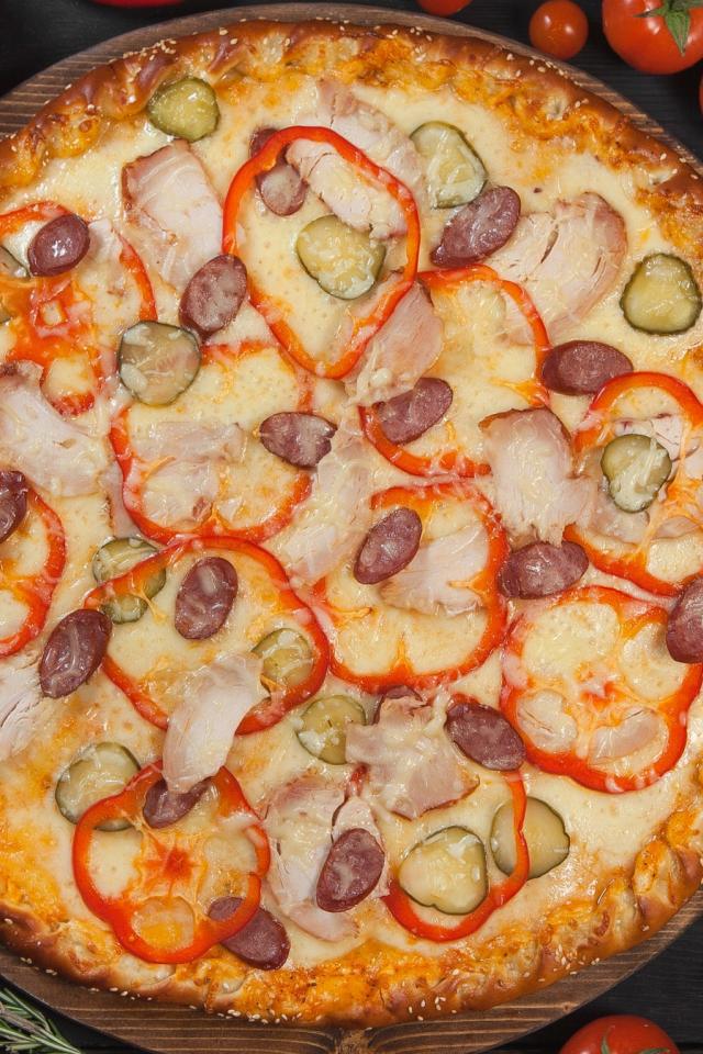Обои Пицца со сладким перцем, солеными огурцами и колбасками