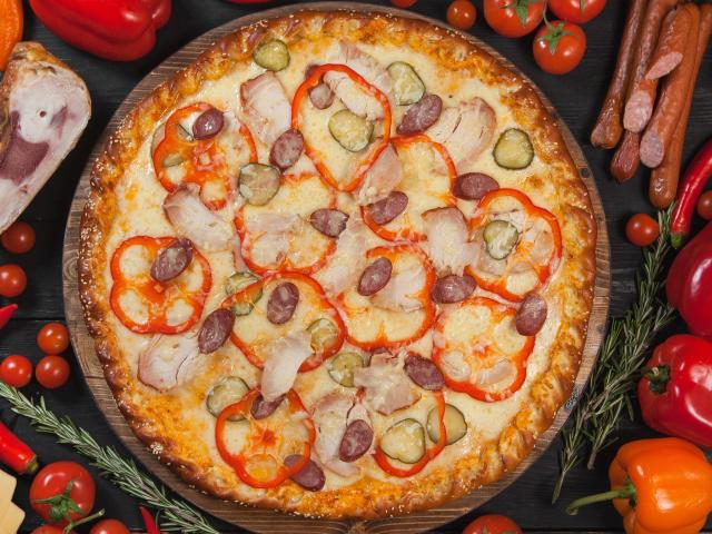 Обои Пицца со сладким перцем, солеными огурцами и колбасками