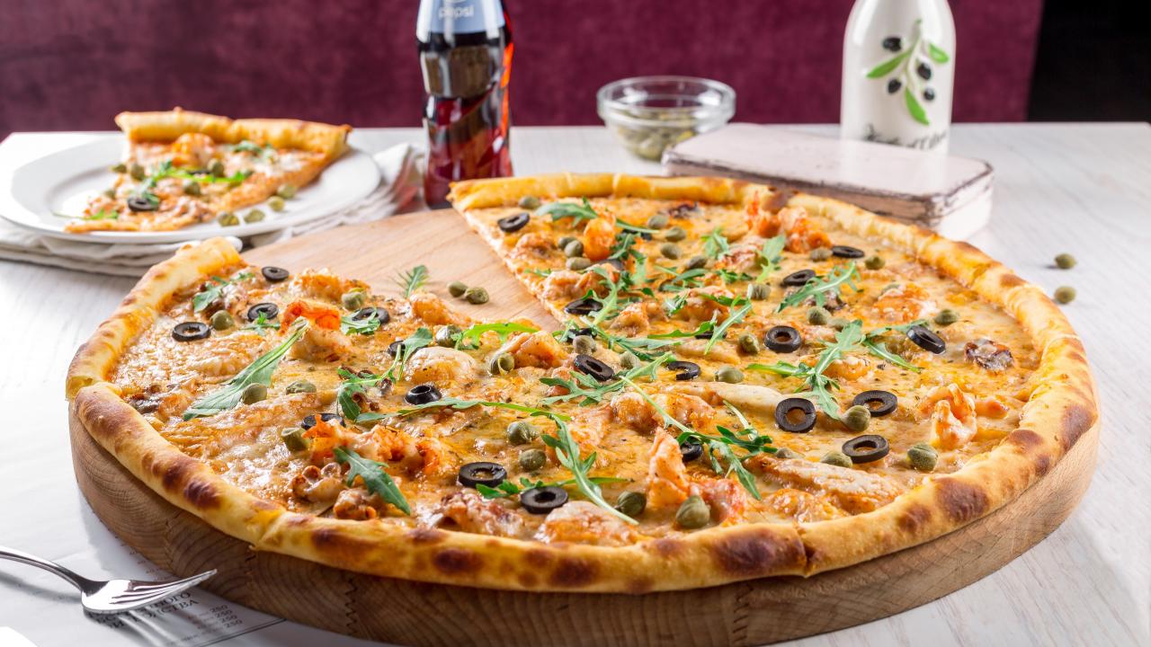 Обои Пицца с оливками на столе с бутылкой пепси