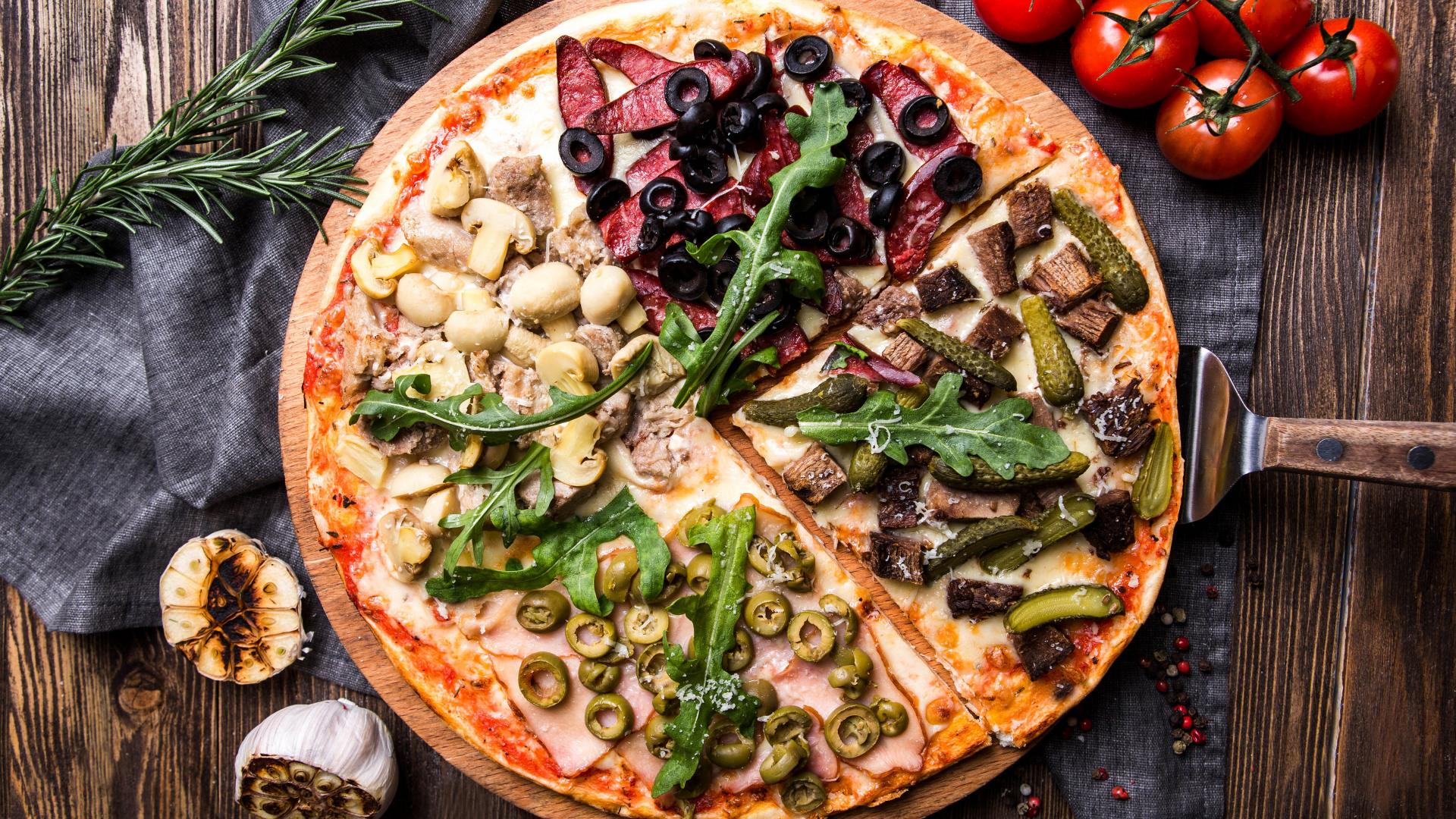 Обои Пицца с оливками, грибами, колбасой и говядиной
