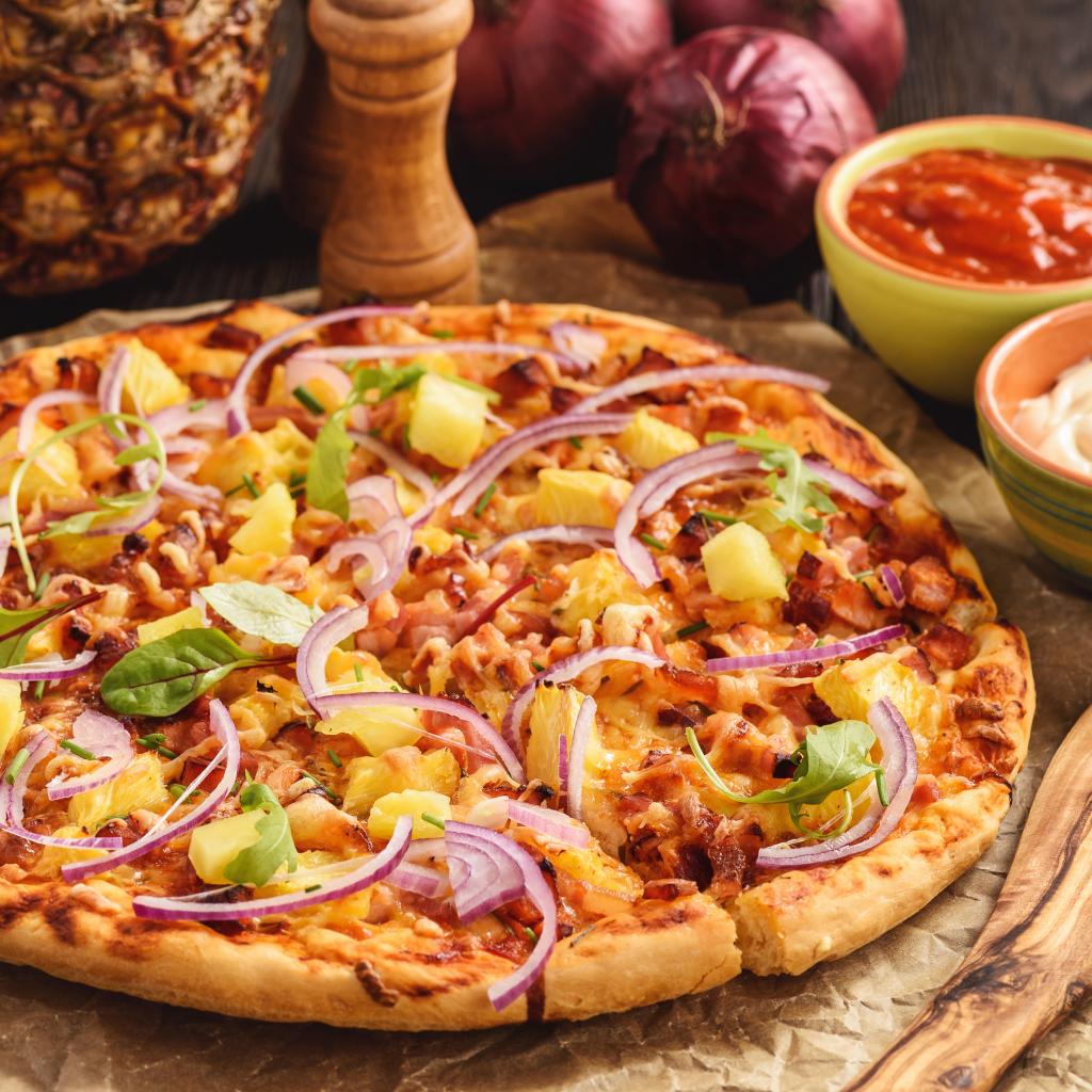 Обои Пицца с ананасами и луком на столе с соусом