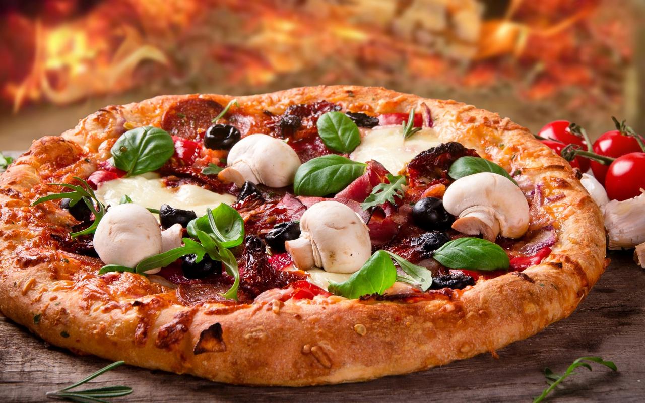 Обои Аппетитная пицца с колбасой, беконом и грибами
