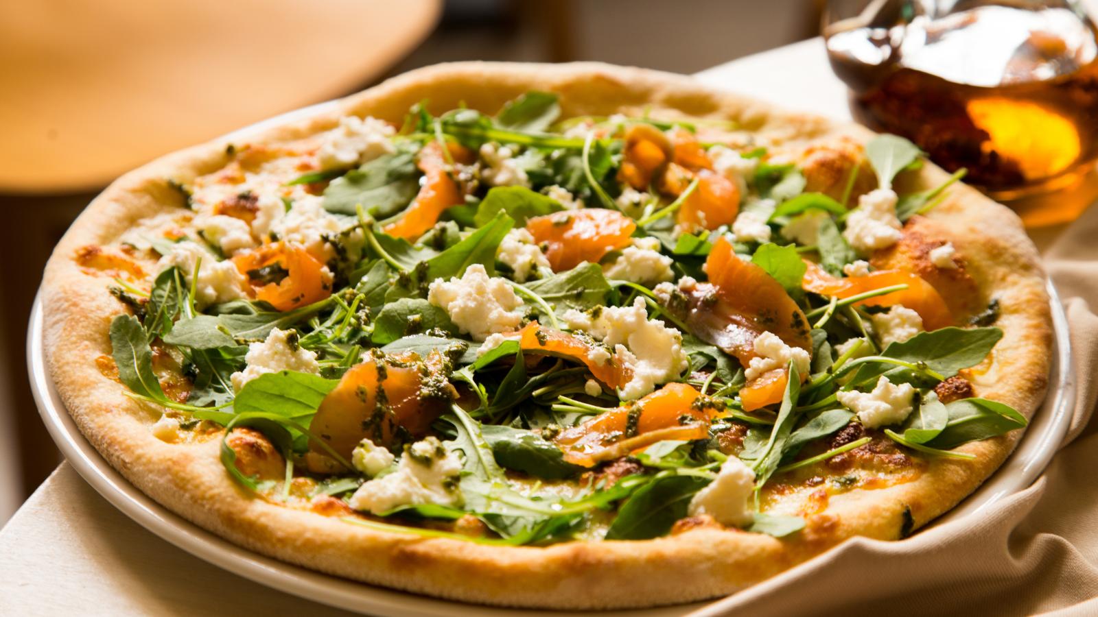 Обои Аппетитная пицца с рыбой и зеленью на столе