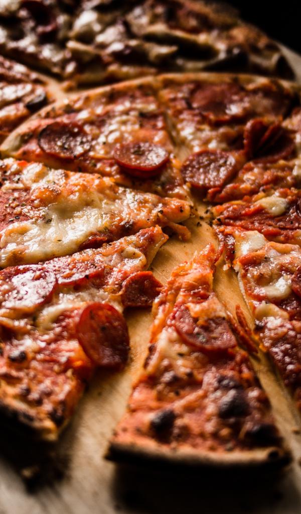 Обои Пицца нарезана кусками на деревянной доске