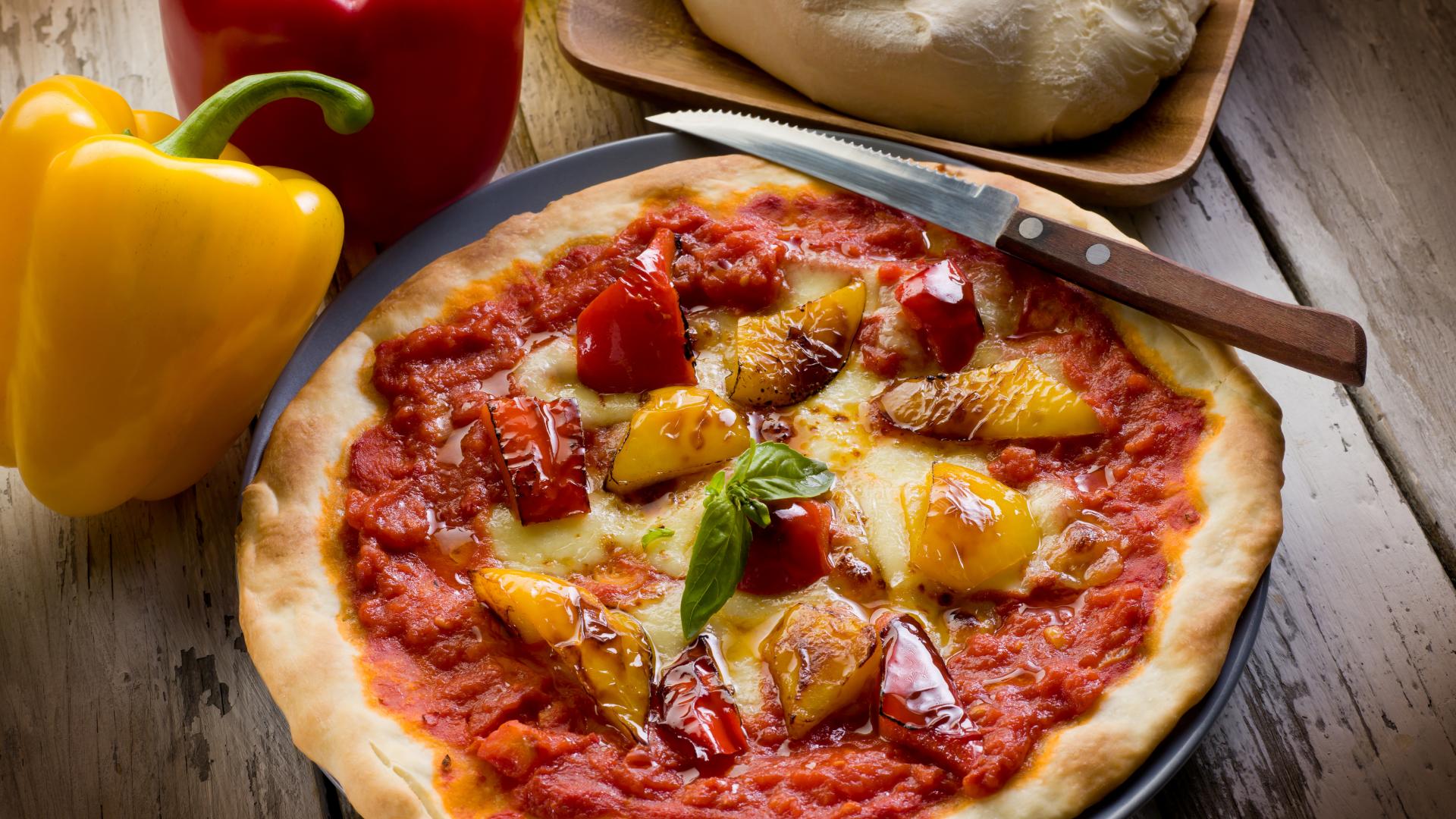 Обои Пицца с болгарским перцем и сыром на столе