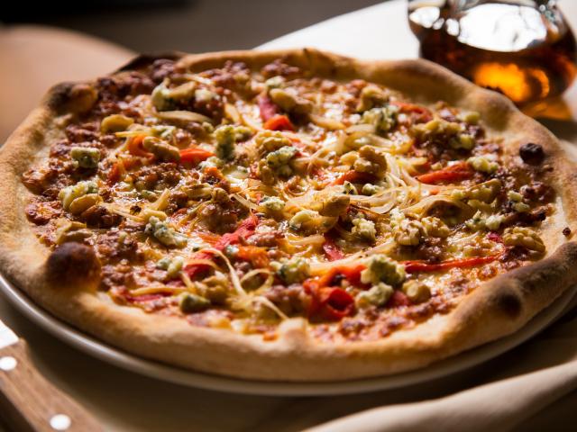 Обои Пицца с зажаренными краями на столе