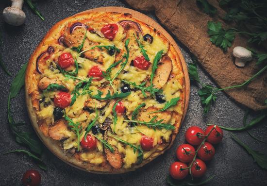 Обои Пицца с мясом, помидорами, сыром и рукколой на столе