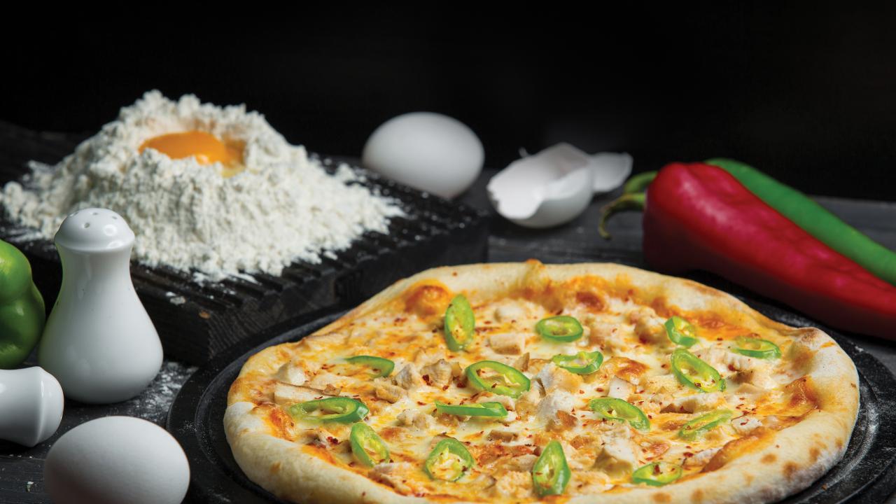 Обои Пицца с сыром нарезана кусочками на столе с мукой и яйцами