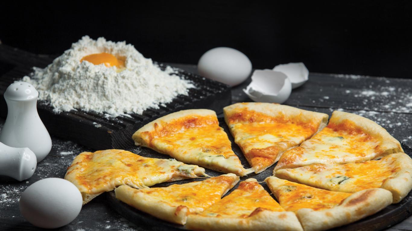 Обои Пицца с сыром нарезана кусочками на столе с мукой и яйцами
