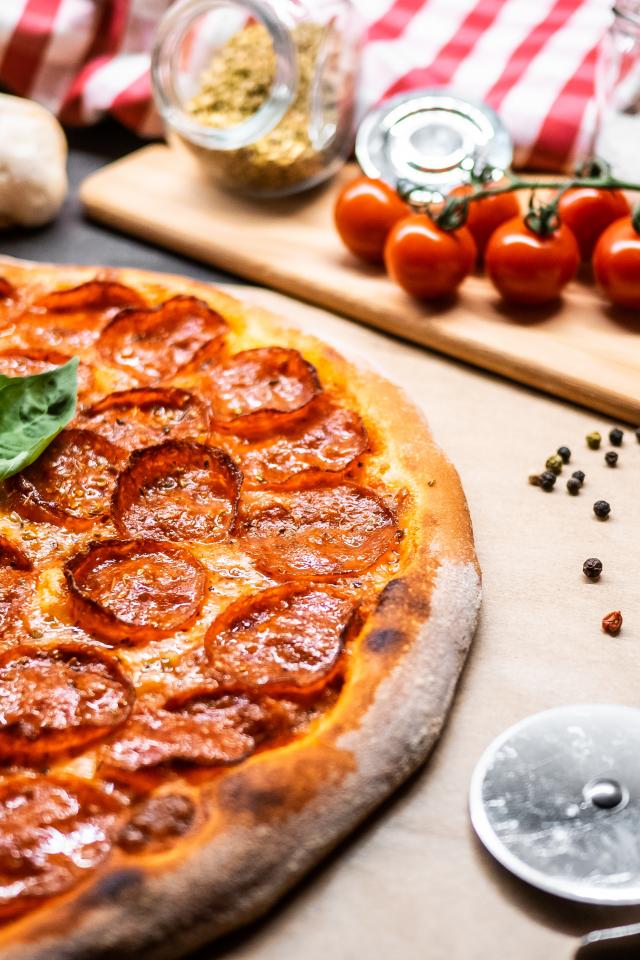 Обои Пицца пепперони на столе с овощами и специями
