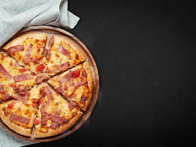Обои Пицца с кусочками бекона на доске на черном фоне