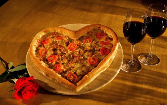 Обои Пицца в форме сердца на столе с розой и двумя бокалами вина