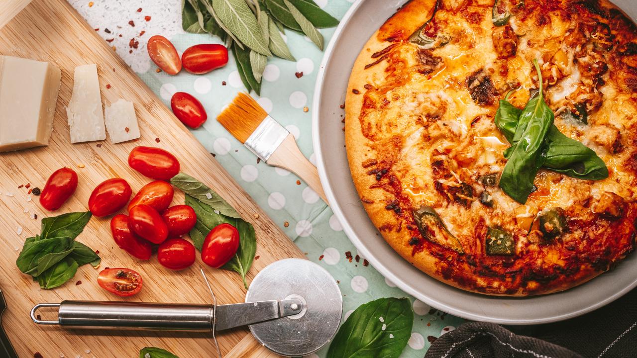 Обои Румяная пицца на столе с сыром и помидорами