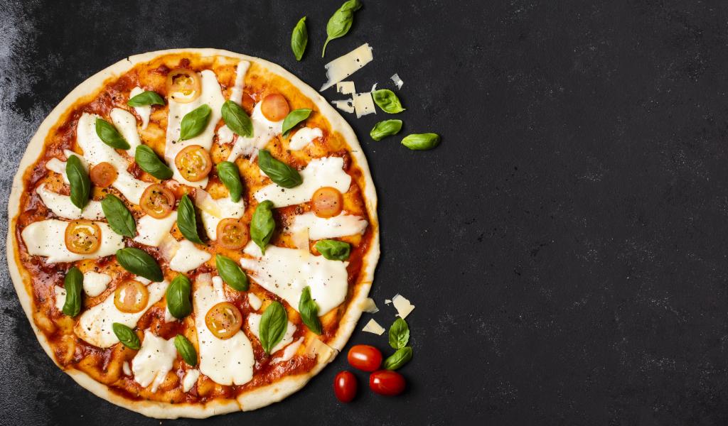 Обои Пицца с сыром, базиликом и помидорами на черном столе