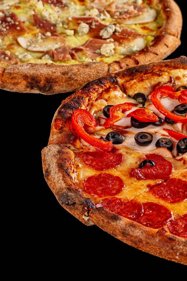 Обои Две аппетитные пиццы на черном столе