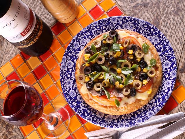 Обои Итальянская пицца с оливками на столе с вином