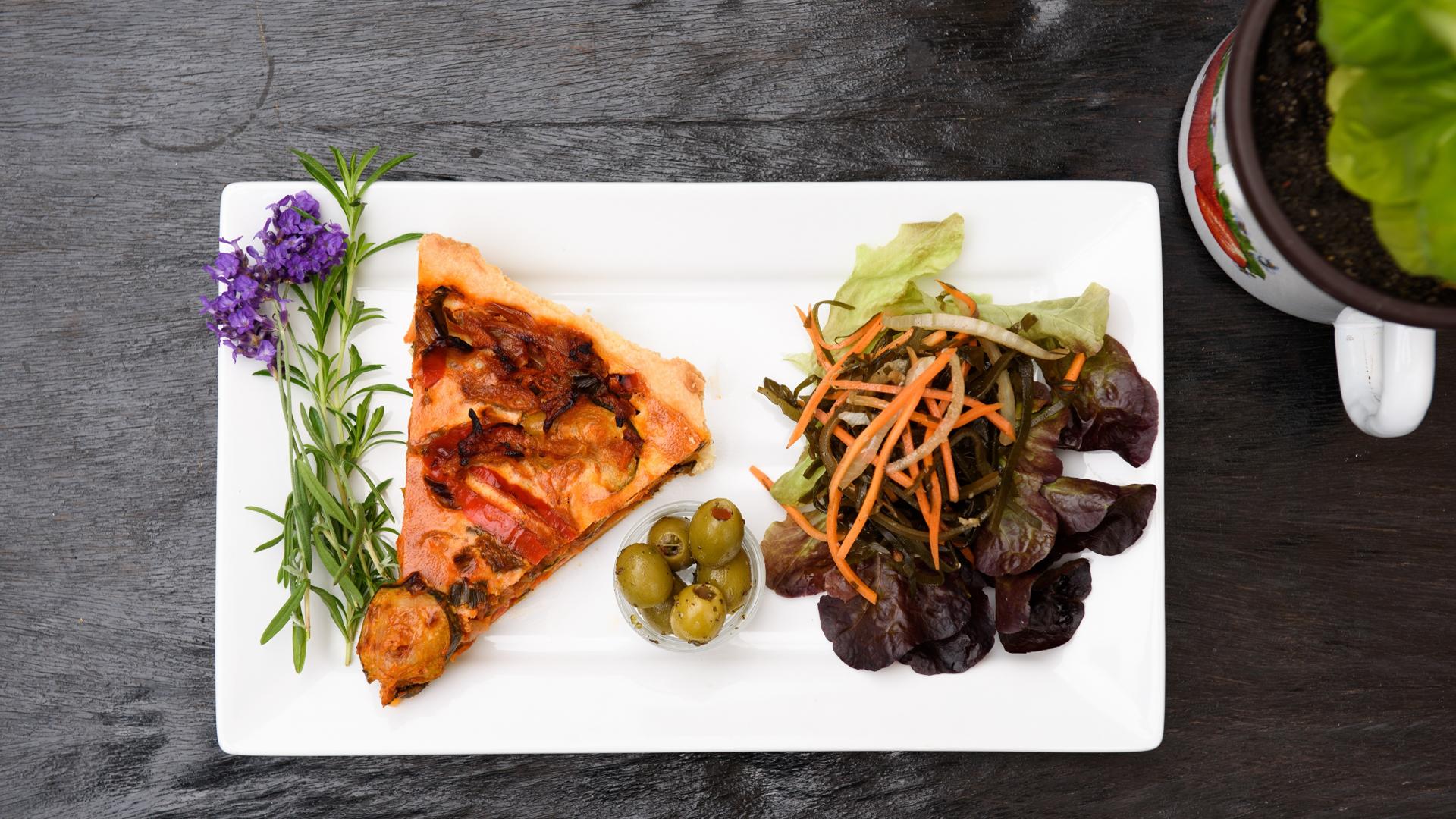 Обои Кусок пиццы с салатом и оливками на белой тарелке