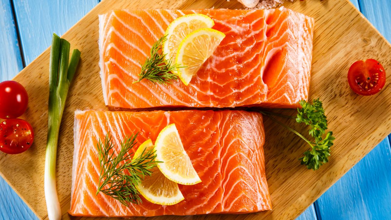 Обои Аппетитные кусочки красной рыбы с лимоном