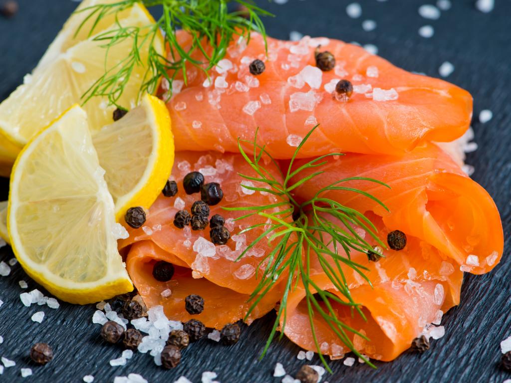 Обои Красная рыба с улитками и красной икрой на столе с лимоном и базиликом