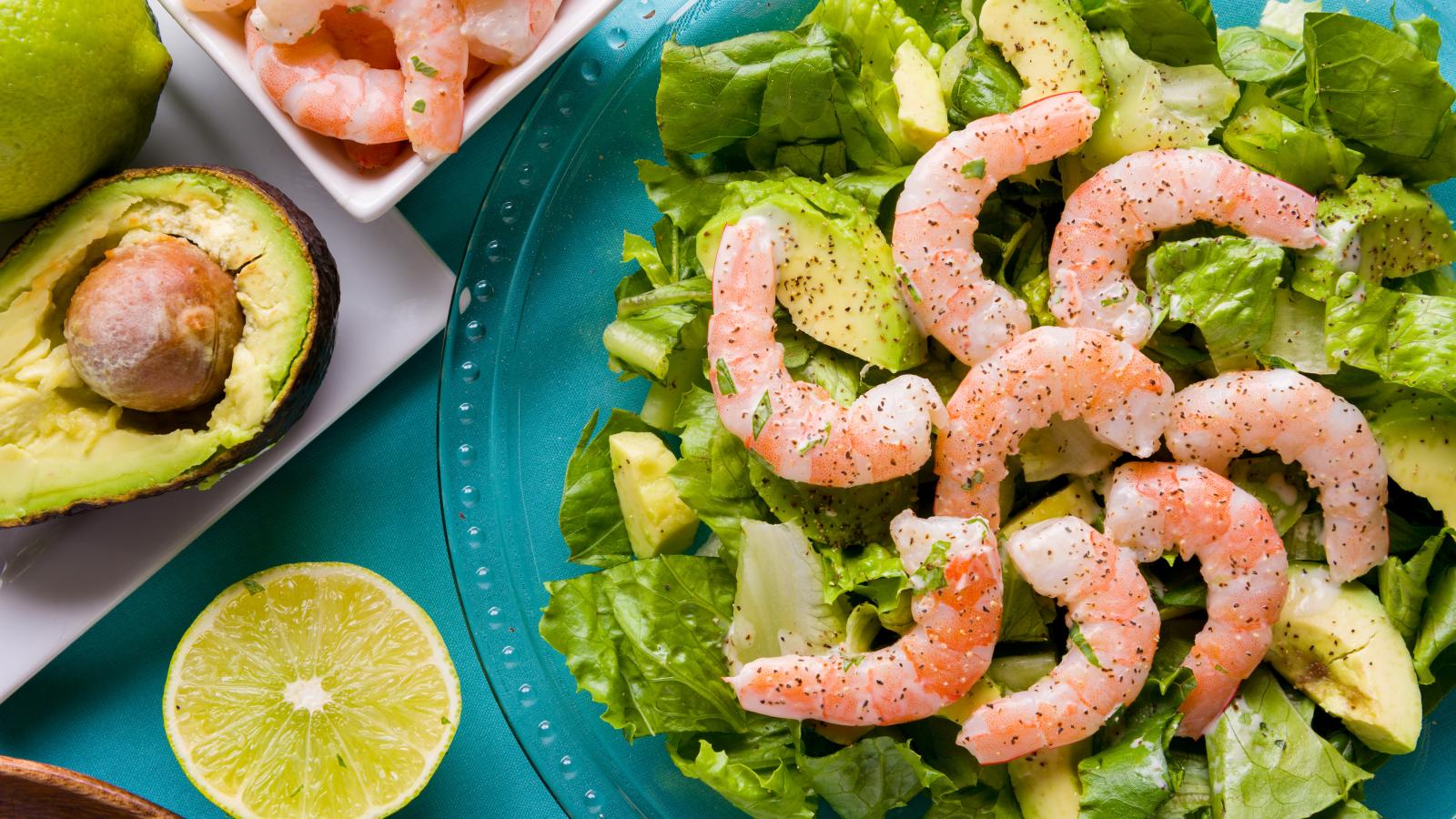 Обои Вкусный салат с авокадо, лимоном и креветками