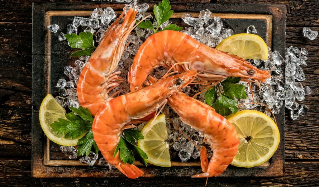 Обои Вареные креветки с лимоном и соусом на большой тарелке