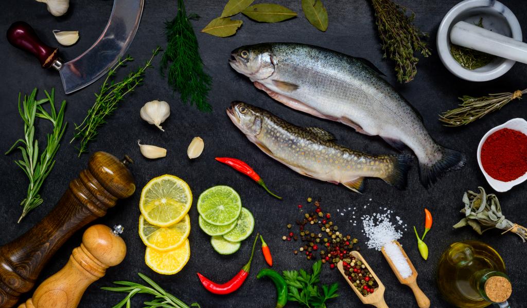 Обои Сырая рыба на столе со специями и лимонами