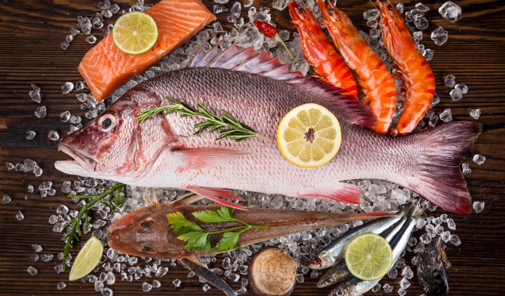 Обои Свежая рыба с креветками и кусочками лимона лежит на кусочках льда