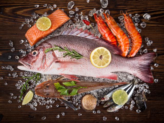 Обои Свежая рыба с креветками и кусочками лимона лежит на кусочках льда